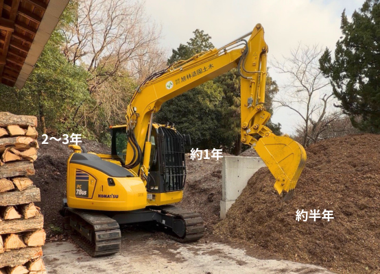 ここでは、剪定で出た枝葉を自社処理しています。チッパーで粉砕してバーク堆肥にしています。